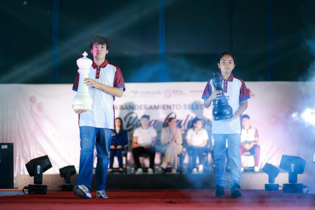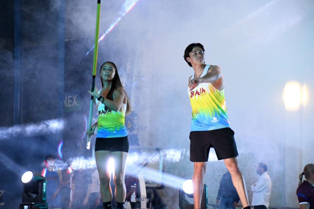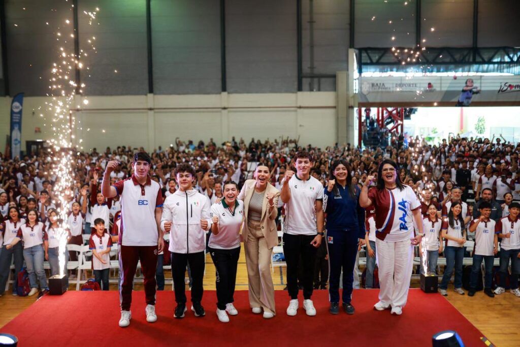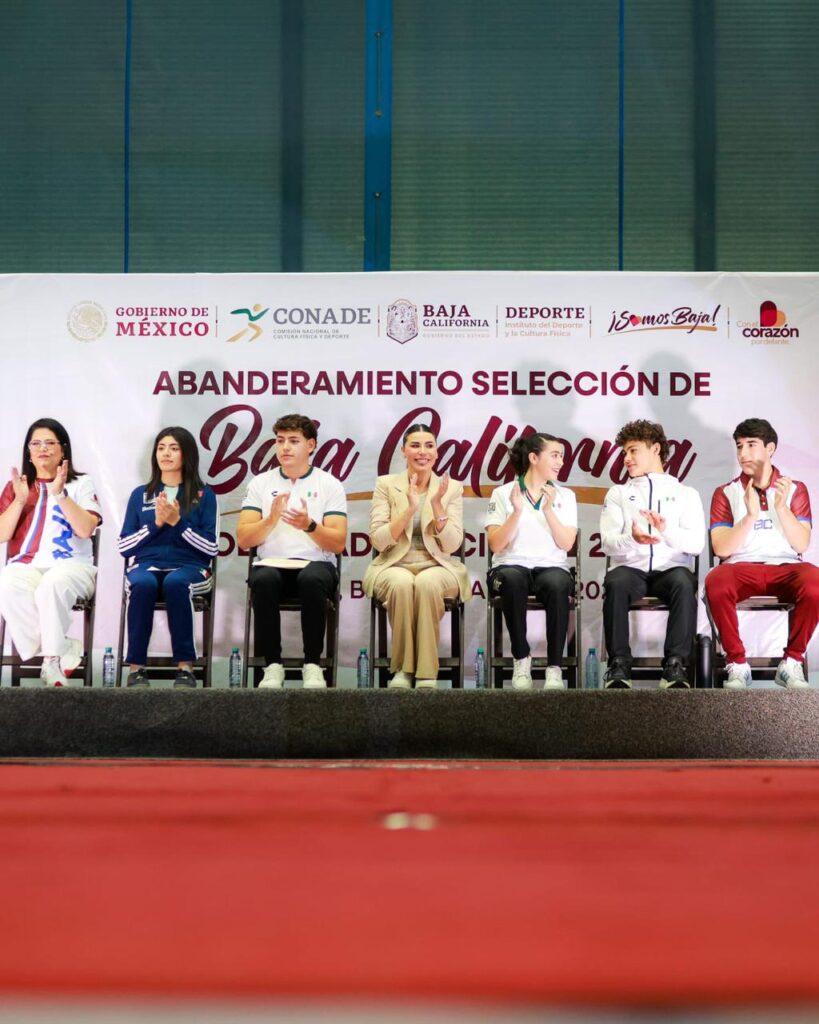 Durante el acto protocolario, la gobernadora abanderó a la delegación estatal, haciendo entrega del estandarte de Baja California a la escolta conformada por destacados atletas: Luigi Guadalupe Terres Balderrama (ajedrez), Dana Paola Herrera Carrillo (atletismo), Antonella Huerta Castro y Valentina Romo Murillo (clavados), Danna Silvana Romo Ostos (esgrima), Chayeon Kim (racquetbol) y Fernanda Jimena Osuna (taekwondo), quienes recibieron con orgullo el lábaro que representará a la entidad en la justa nacional.