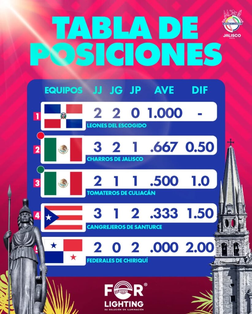 Tras estos resultados, Leones del Escogido lideran el standing con marca de 2-0, seguidos por Charros de Jalisco (2-1), Tomateros de Culiacán (1-1), Cangrejeros de Santurce (1-2) y Federales de Chiriquí (0-2).