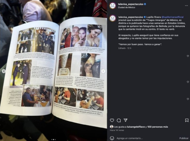 Debido a esta situación, Lupillo Rivera y su equipo legal decidieron que en la edición de su libro Tragos Amargos, que será distribuida en México, se eliminen todas las fotografías donde aparece Belinda, aunque el contenido del texto permanecerá sin modificaciones.