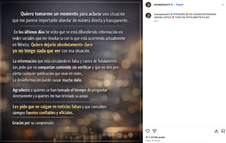 María Julissa también hizo un llamado a no compartir información sin verificar, advirtiendo que las noticias falsas pueden causar daño. Desde entonces, ha mantenido apariciones breves en sus redes sociales, mientras busca mantenerse al margen de la polémica.