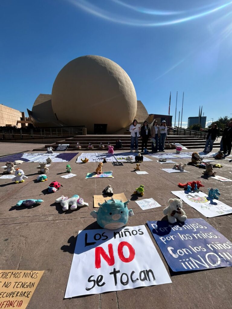 En la explanada del Centro Cultural Tijuana (CECUT), para realizar la «Manifestación Pacífica: ¡Peluches que Acompañan!» en el marco del Día Internacional para la Prevención del Abuso Sexual Infantil.